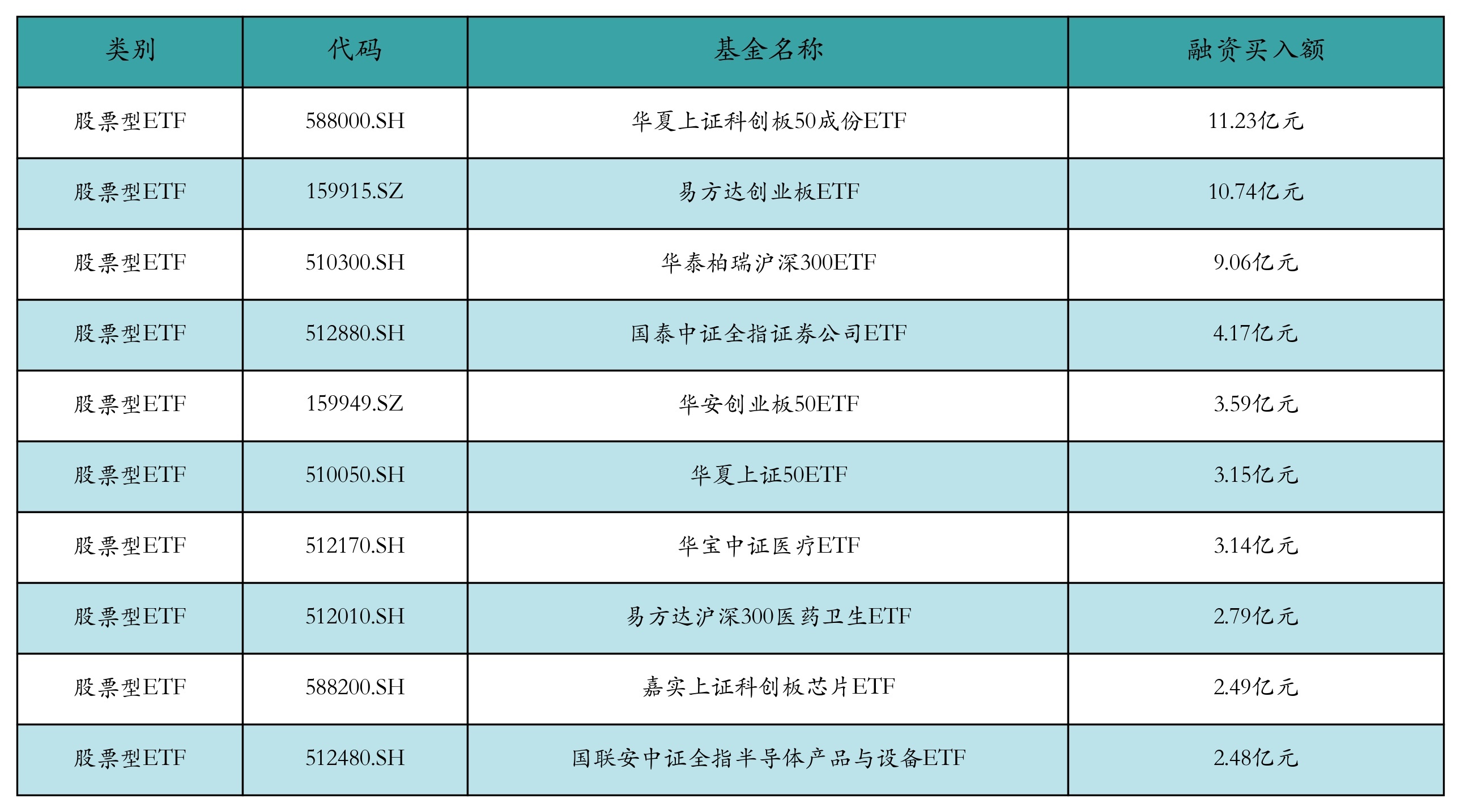 昨日股票型ETF融资买入额最高的3支ETF及其买入金额分别为:华夏上证科创板50成份ETF(11.23亿元)、易方达创业板ETF(10.74亿元)、华泰柏瑞沪深300ETF(9.06亿元)。融资买入额前10详情见下表: