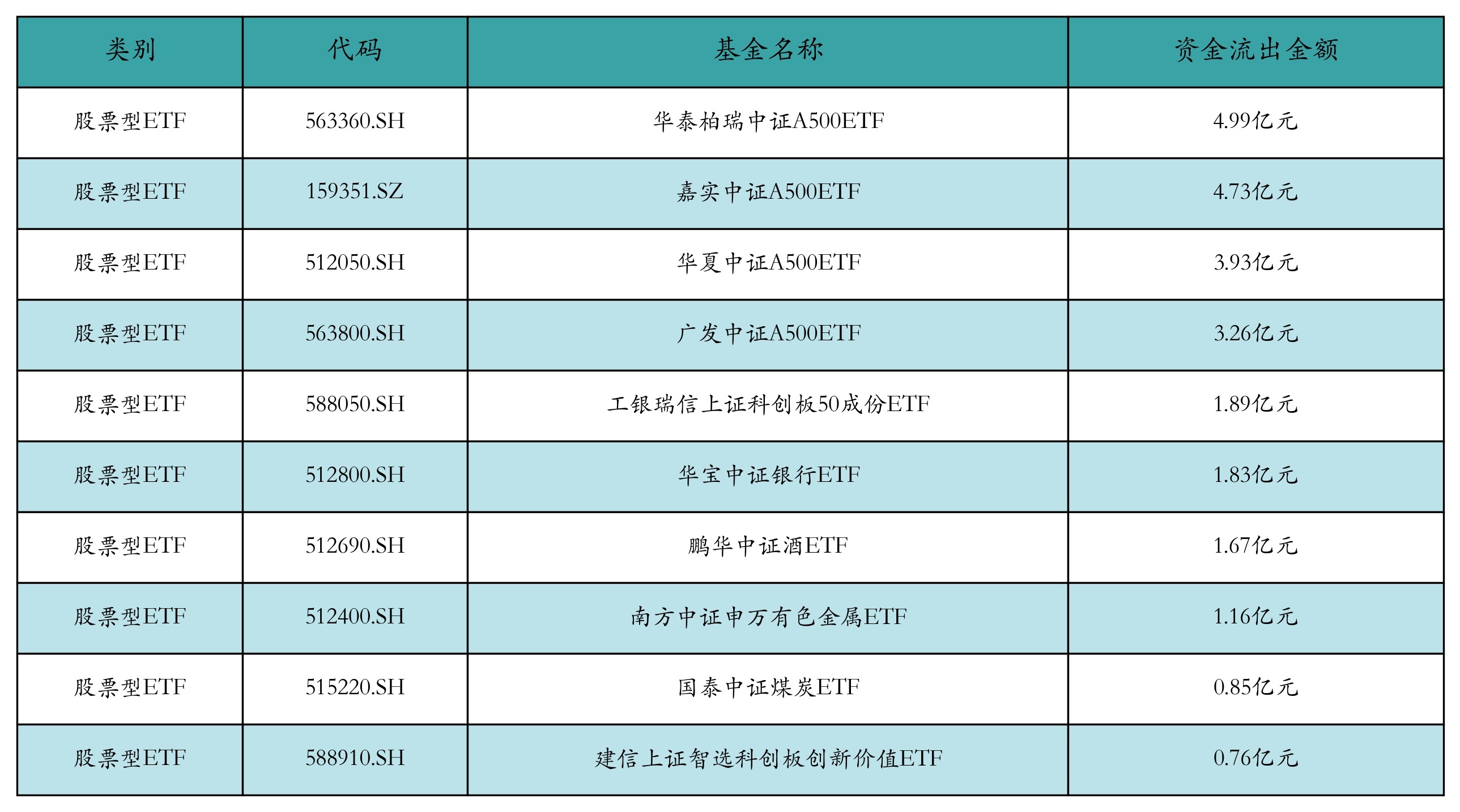 昨日股票型ETF资金流出最多的3支ETF及其流出金额分别为:华泰柏瑞中证A500ETF(流出4.99亿元)、嘉实中证A500ETF(流出4.73亿元)、华夏中证A500ETF(流出3.93亿元)。资金流出前10详情见下表: