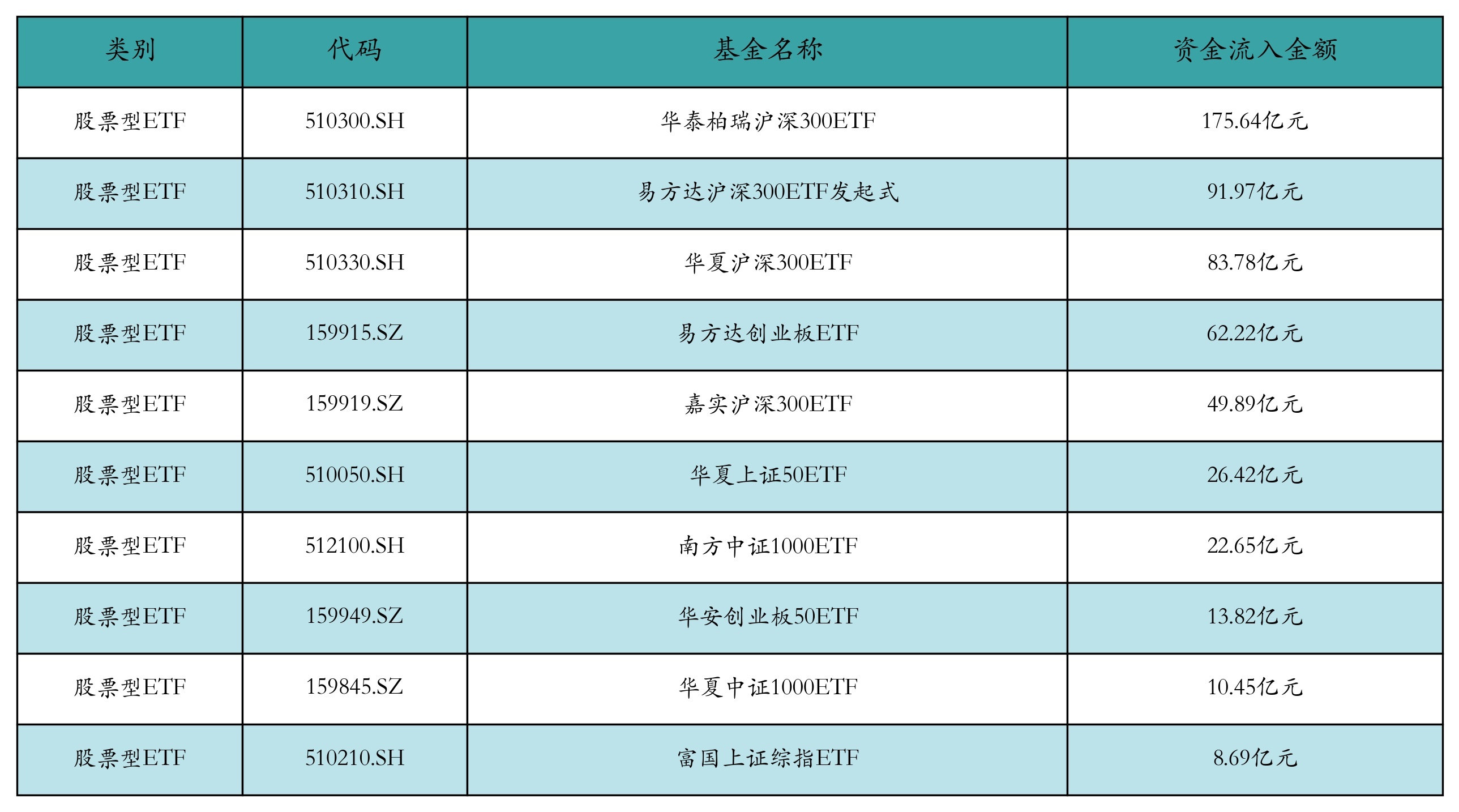 昨日股票型ETF资金流入最多的3支ETF及其流入金额分别为:华泰柏瑞沪深300ETF(流入175.64亿元)、易方达沪深300ETF发起式(流入91.97亿元)、华夏沪深300ETF(流入83.78亿元)。资金流入前10详情见下表: