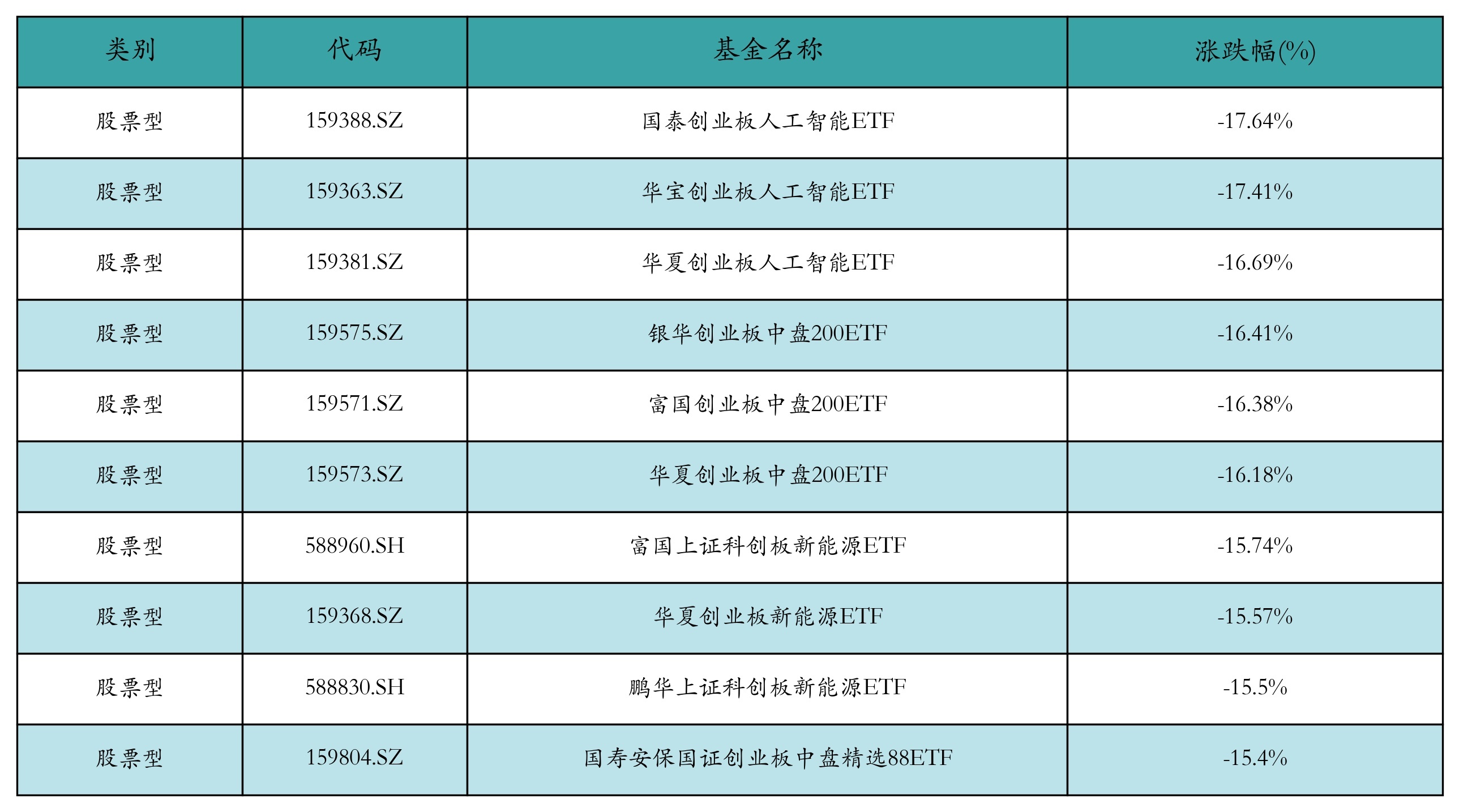 昨日股票型ETF跌幅最大的3支ETF及其收益率分别为:国泰创业板人工智能ETF(-17.64%)、华宝创业板人工智能ETF(-17.41%)、华夏创业板人工智能ETF(-16.69%)。跌幅前10详情见下表: