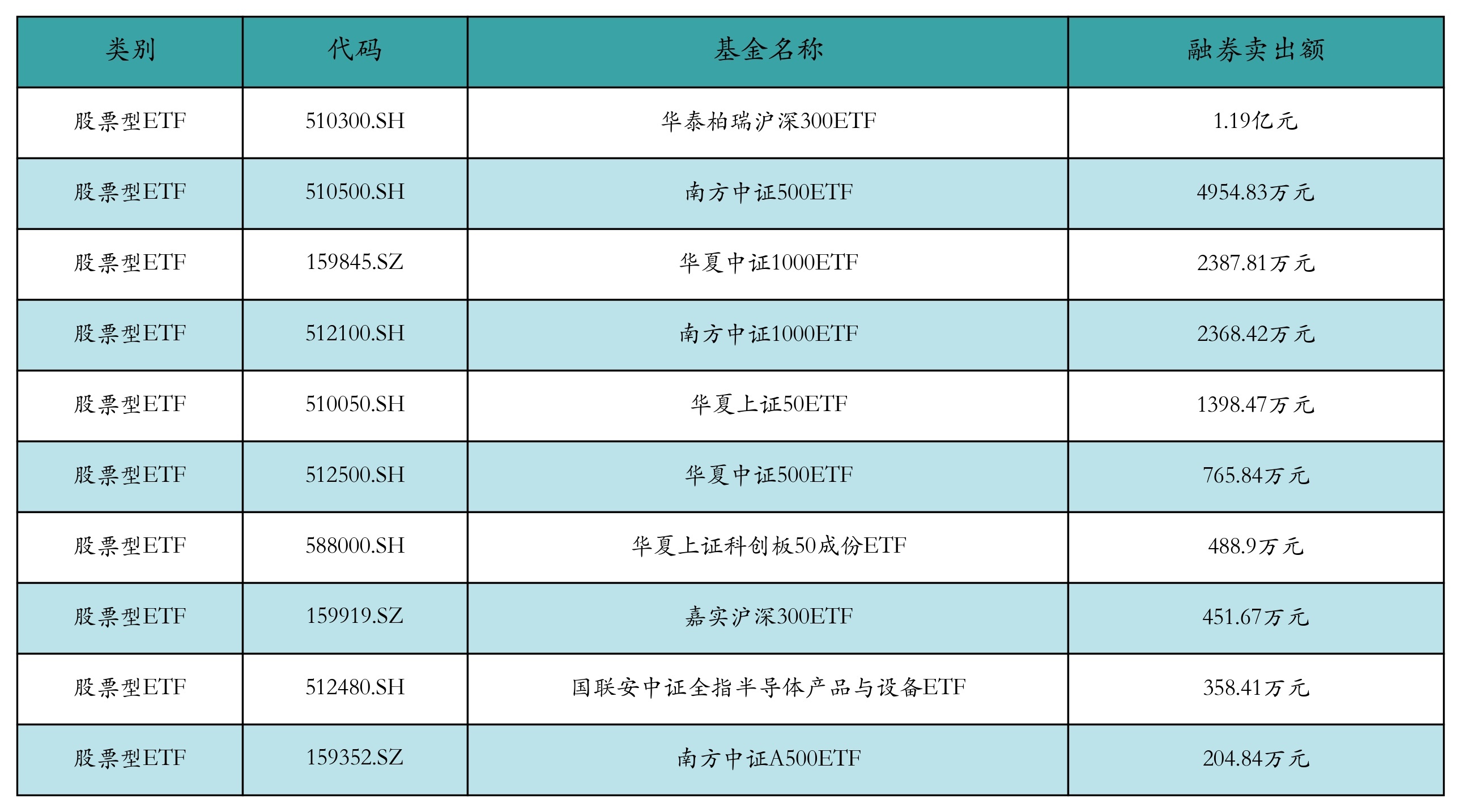 昨日股票型ETF融资卖出额最高的3支ETF及其卖出金额分别为:华泰柏瑞沪深300ETF(1.19亿元)、南方中证500ETF(4954.83万元)、华夏中证1000ETF(2387.81万元)。融券卖出额前10详情见下表: